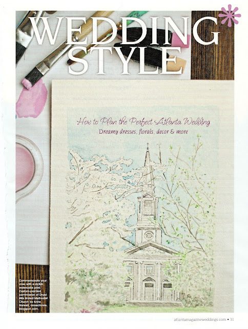 I was very happy and honored to have one of my custom commissions featured in Atlanta Weddings Spring/Summer issue, on newstands March 1st. This particular painting I did is of Druid Hills United Methodist Church.